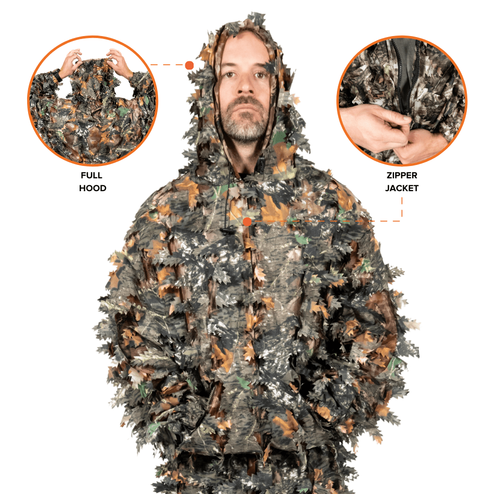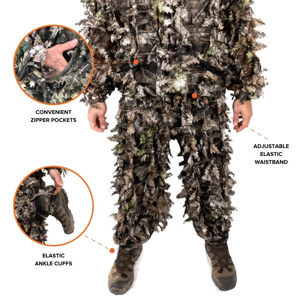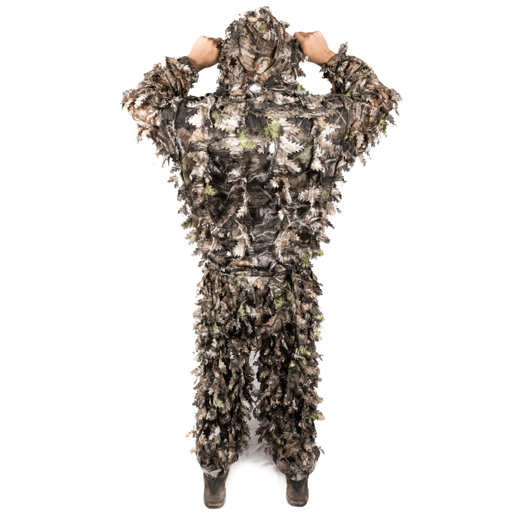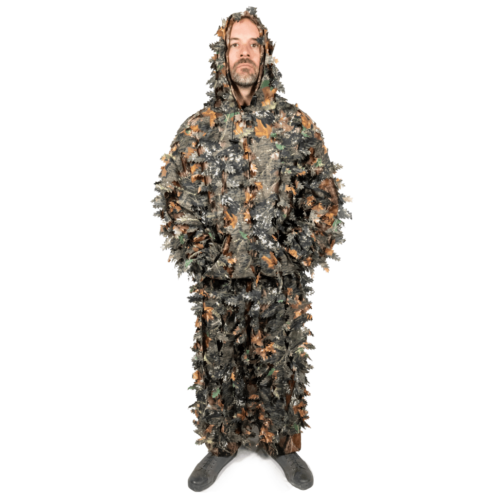 The Arcturus 3D Leafy Camo Suit is a super light, comfortable and silent three dimensional camouflage suit. This suit consists of a lightweight polyester mesh shell which is covered with over a thousand leaves designed to break up your outline and form. Use this suit in heavily wooded and bush areas where a ghillie suit may snag too much. The leaves on this suit will not snag or catch brush and dirt. The entire suit weighs 18 oz (ML size) and packs easily a large pocket or small bag.