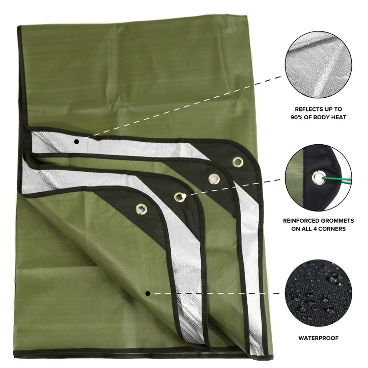 ALL WEATHER BLANKET: This unique blanket features a Mylar reflective side which can be used to reflect heat, create a radiant barrier, or signal for help. The other side is made of two layers of polypropylene, to se as a blanket, tarp or shelter.