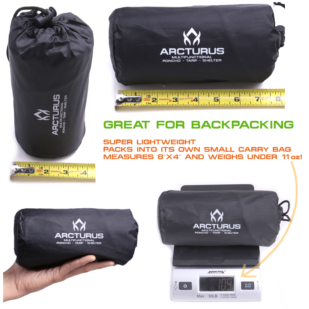 Stay dry and prepared with this lightweight, compact poncho, perfect for sporting events, hunting, or camping. It doubles as a ground tarp or lean-to and features steel grommets on all corners for secure tie-downs. Weighing just under 11 oz (310g), it's an essential addition to any outdoor kit.
