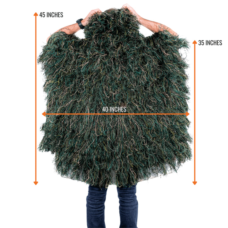 Built using the same 7-color blend of ghillie thread as our Woodland Ghost Ghillie Suits, we added adjustable elastic drawstrings at the end of each “sleeve” to secure the poncho around the elbow while crawling. You’ll also find snap buttons on either side of the poncho to give you full or partial coverage.